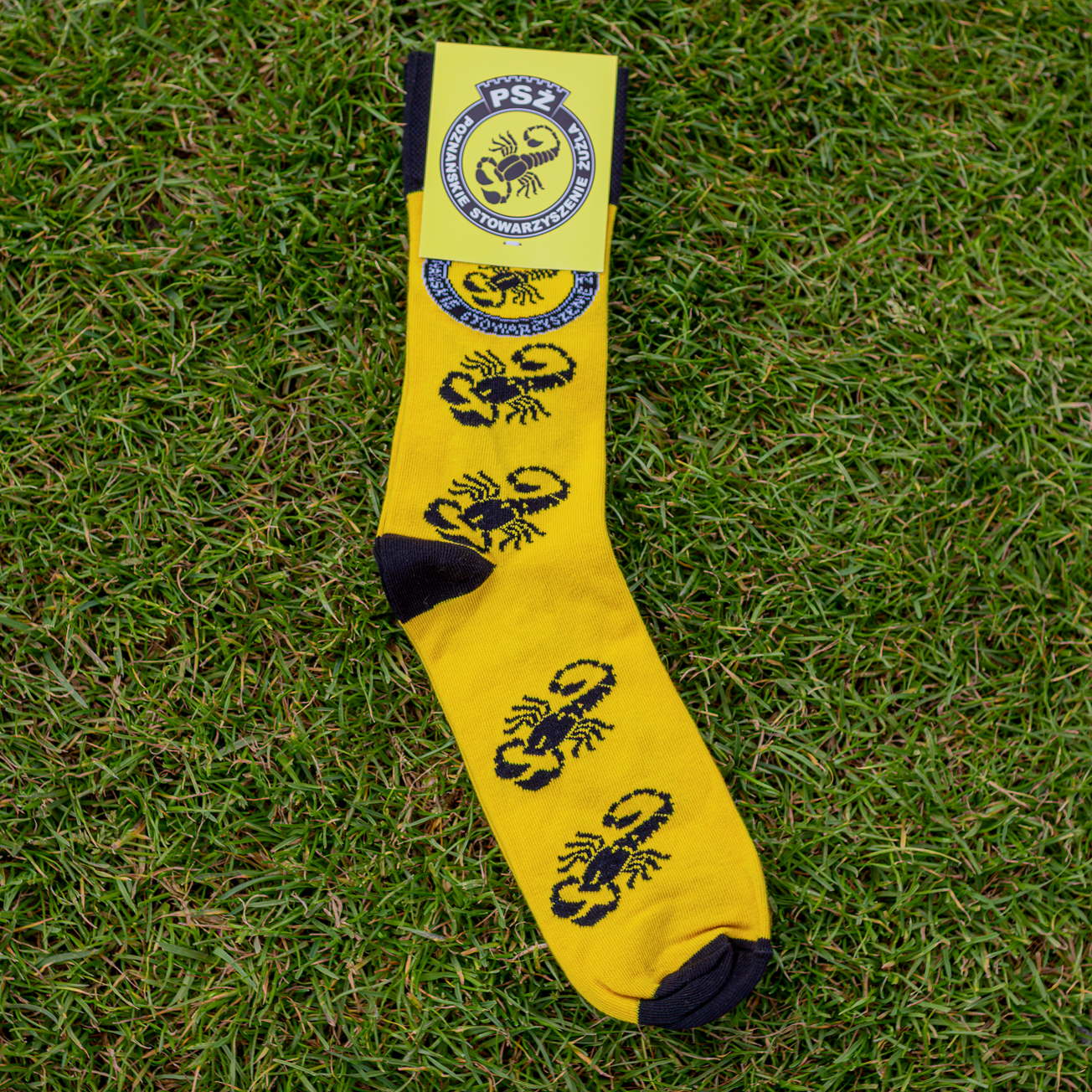 Wyraziste, żółto-czarne skarpetki z motywem skorpiona to obowiązkowy element garderoby każdego kibica PSŻ Poznań. Wygodne, elastyczne i rzucające się w oczy – sprawdzą się zarówno na meczu, jak i na co dzień. Noś je z dumą i pokaż, że czarny sport masz… nawet w kroku!